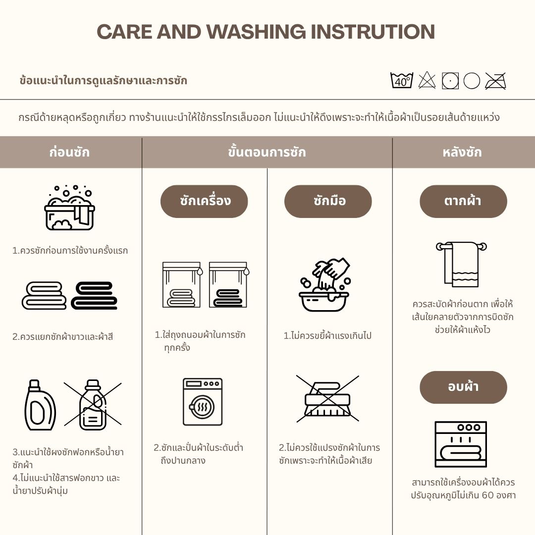 2. แนะนำให้ทำความสะอาดด้วยการซักมือ หากใช้เครื่องซักผ้า ควรนำผ้าขนหนูใส่ในถุงซักผ้าทุกครั้ง